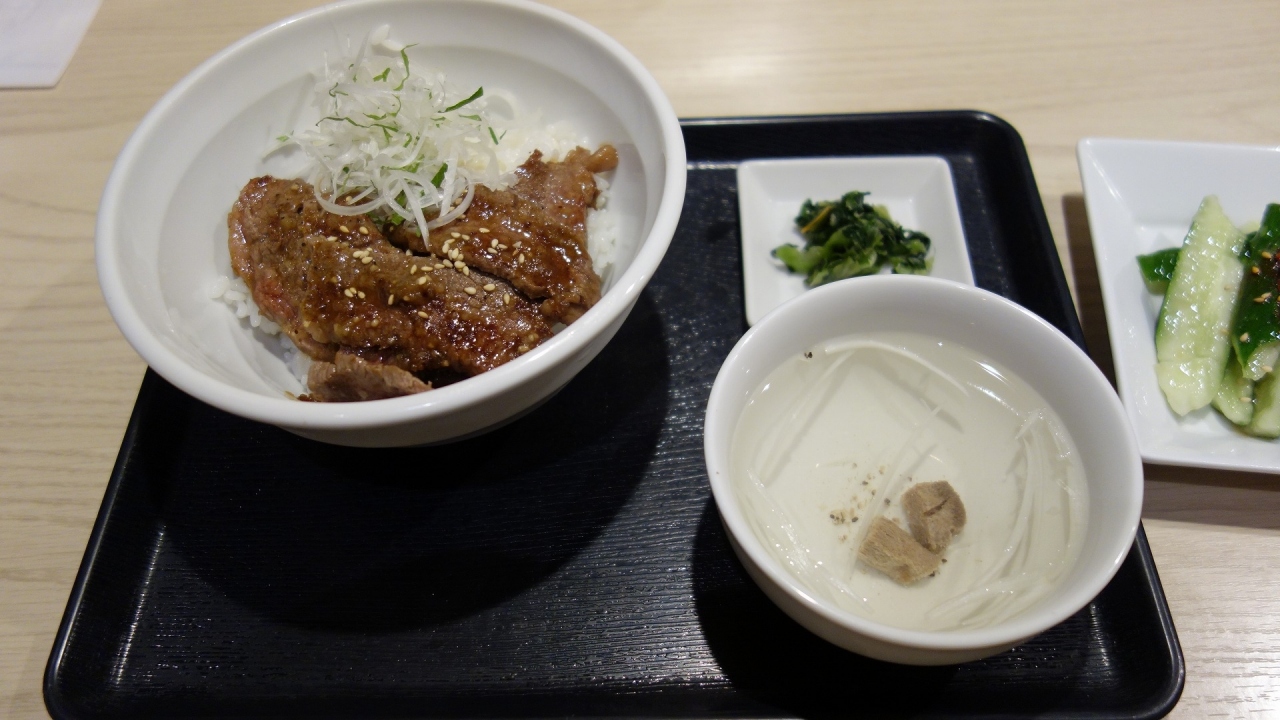 羽田空港第2ターミナル出発ラウンジの上のデッキ上にある肉丼屋。牛たん丼など肉のどんぶりが充実している。今回はロース丼を注文。柔らかいロース肉が載ったどんぶりに牛テールスープが着く。提供も早く、出発前の腹ごしらえに便利。