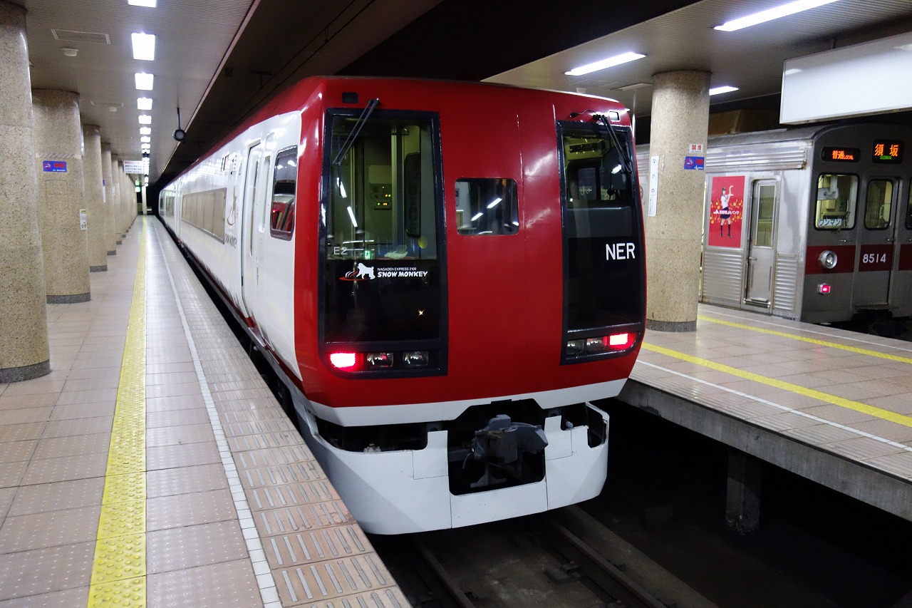 北陸新幹線の長野駅を降りたのち、駅前の地下道入り口に入り長野電鉄の長野駅へ。地下の長野電鉄・長野駅に停車中のスノーモンキーを見ると、まるで少し前の総武線東京駅のよう。隣には、元小田急ロマンスカーが止まっており、首都圏の看板列車が活躍している。
