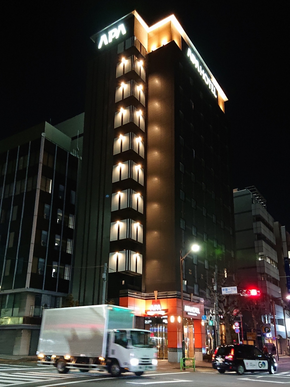 築地周辺にいくつもあるアパホテルの1つ。有楽町線の新富町駅と日比谷線の八丁堀駅からほぼ等距離の位置にあり、銀座方面へも徒歩でアクセスできる。客室はアパホテルの標準仕様で、10m2程度にユニットバス、ベッドが詰め込まれた構造。1フロア10室ほどであるが、エレベータは1台のみなので、チェックアウト時間近くはかなり混み合う。