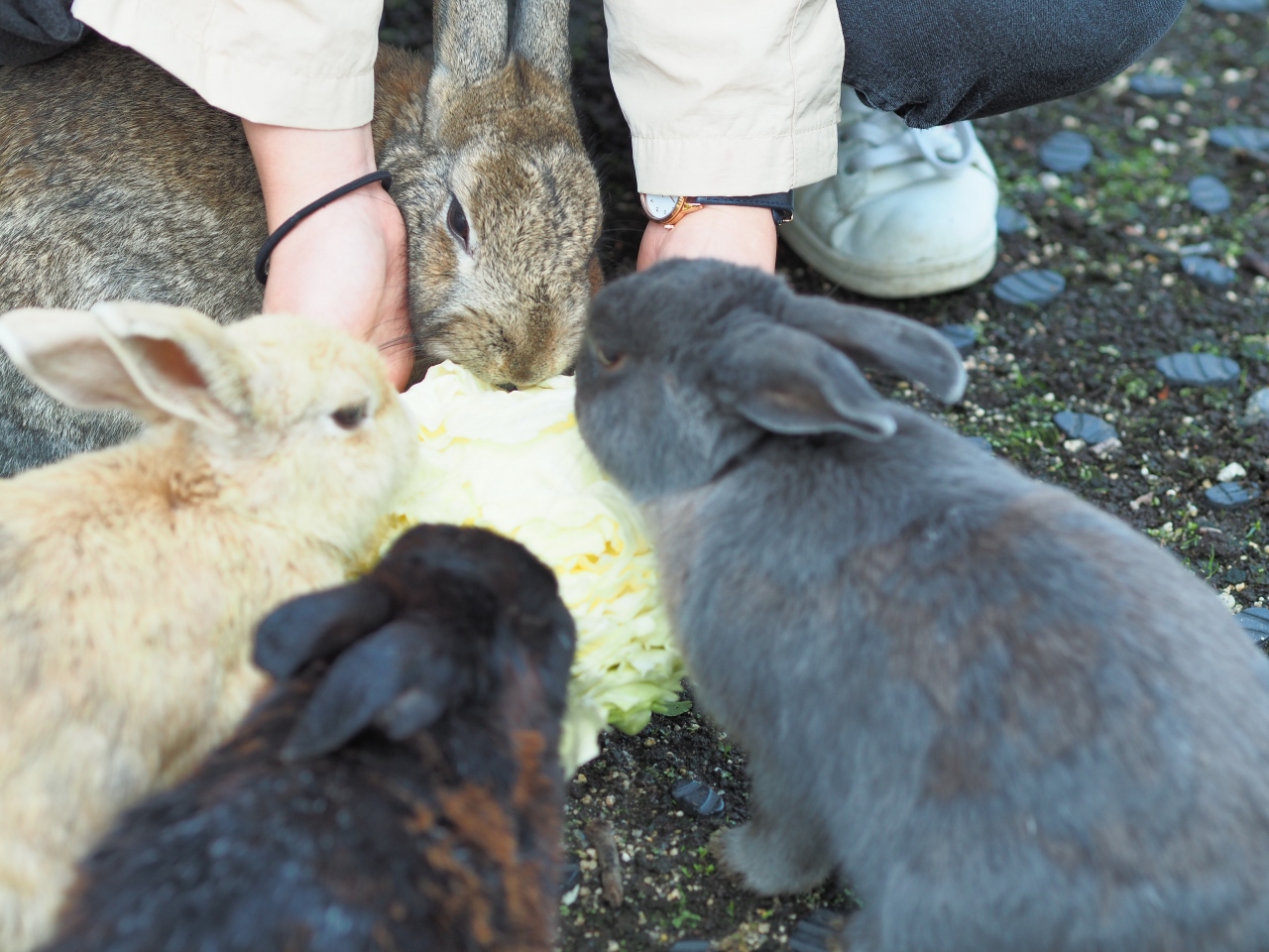 大久野島には700羽の野生のうさぎが暮らしています。人に慣れているので、すぐ寄ってきてくれます。島にはえさは置いてないので、ニンジンやキャベツ等のエサを準備して来られるとより楽しいです。島には休暇村がありレンタサイクルを借りて一周するのも良いです。