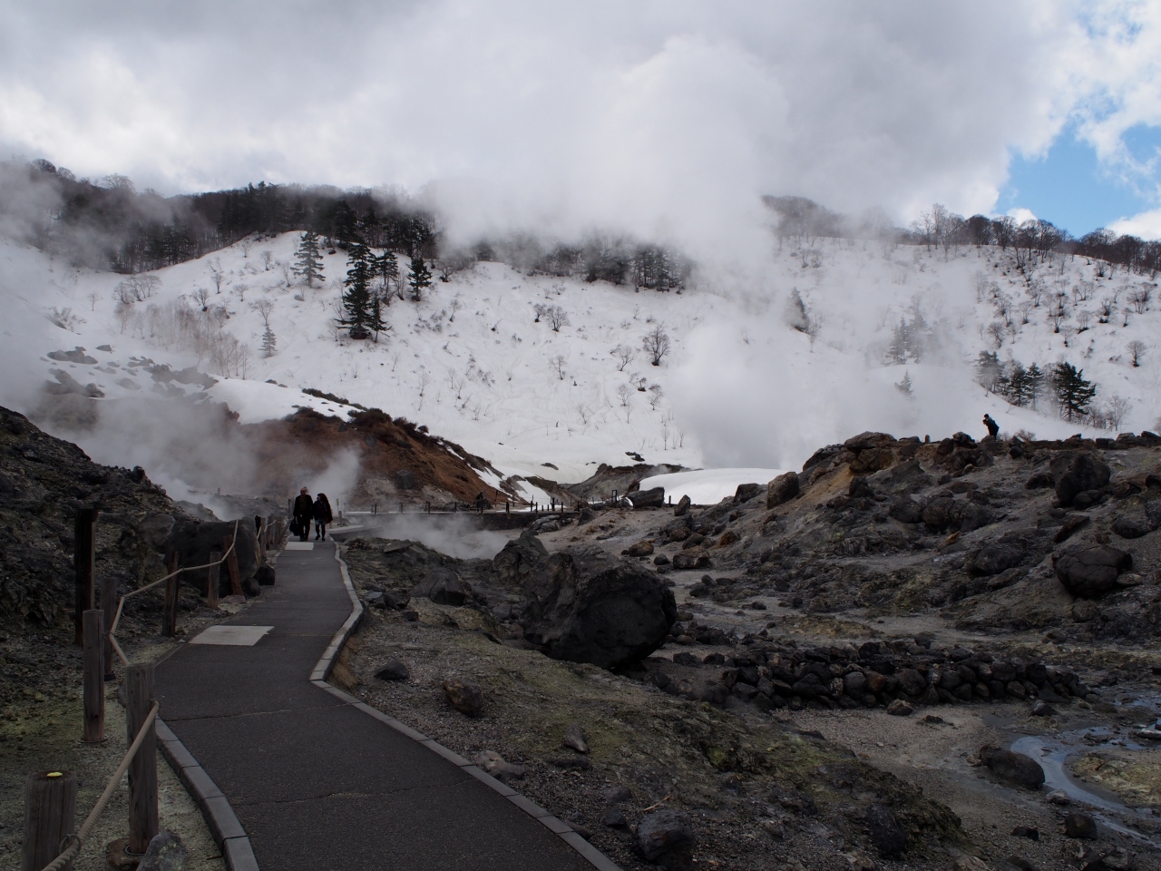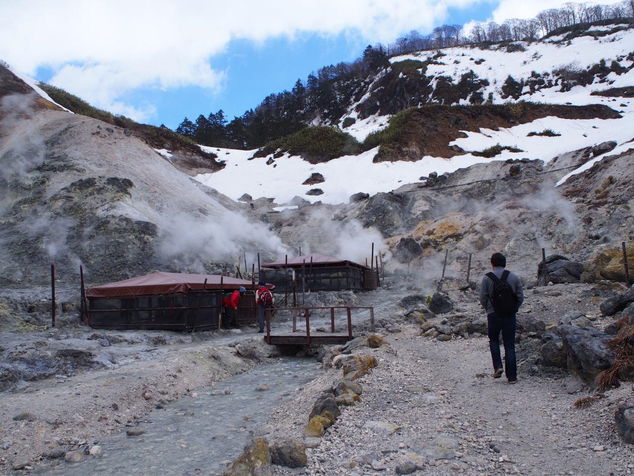 4月に行きましたが、まだ辺りは雪が残っていました。温泉地内は自然研究路が設けられ散策できるようになっており、凄い勢いで温泉の蒸気が噴き出ていました。源泉は98度あるそうです。ござを敷いて天然岩盤浴されている人が多くおられました。