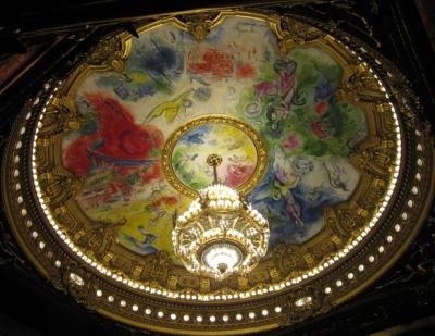 大理石の大階段、グランホワイエの豪華さは宮殿のようです。シャガールの天井画は巨大なもので、色も大変きれいです。衣装や仮面、出演者の写真展示もあり、楽しめます。