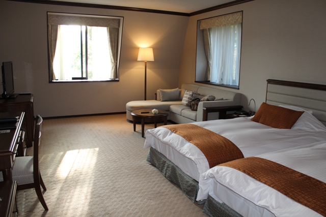 春休み中の平日に宿泊しました。インターネットで予約しましたが、チェックインのとき、一人2000円アップで最上階(4階)の角部屋に変更できるということだったので、変えてもらいました。45平米の広さでした。広いのはよかったけれど、芦ノ湖からの眺めは真正面にど~んという感じではなかったかな。