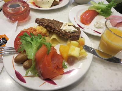 ホテルの朝ごはん。最後の日なので、たくさん食べます。黒いパンにクリーム...