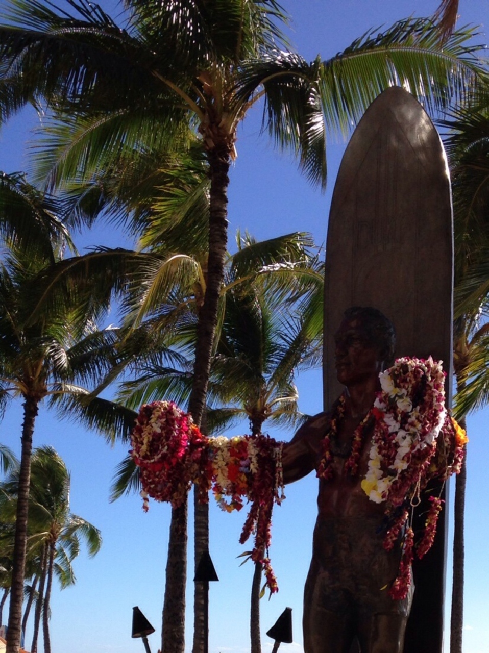 ワイキキビーチのビーチ側、ハイアットリージェンシーホテルの向いのあたりにあります。結構大きな像で、記念撮影しているヒトでいっぱいです。