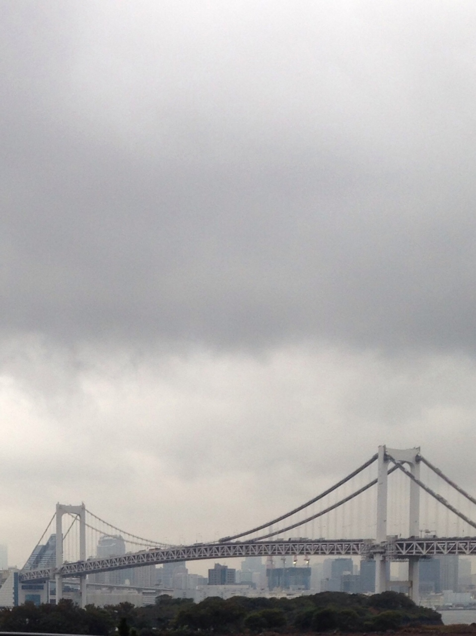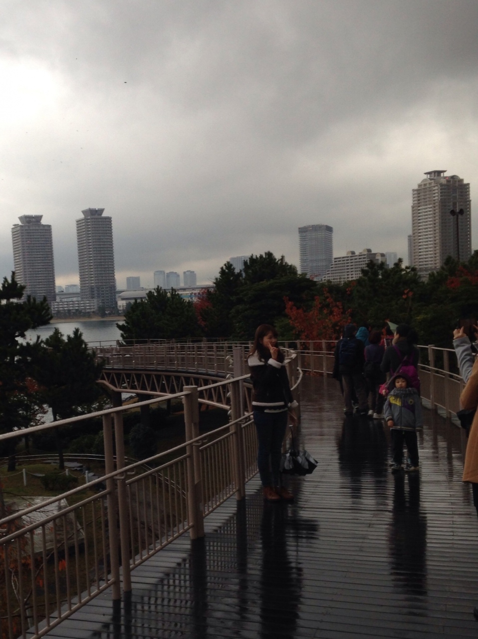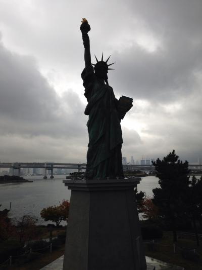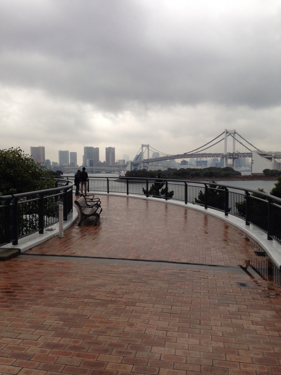 お台場駅から歩いて7~10分ぐらいのトコロにある遊歩道の一部が展望デッキになっています。レインボーブリッジが一望でき、自由の女神像もみえています。夕方で小雨まじりの天気だったので、あまり長居せず写真を撮ったらアクアシティに戻りました。
