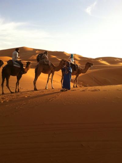 サハラ砂漠で宿泊したくて、モロッコまで行きました。マラケシュ発の現地ツアーに参加し、2泊3日で一泊はアイトベンハッドゥとの間あたりで、もう一泊がサハラ砂漠のテントでした。マラケシュから砂漠エリアまで、バンで移動し、そこからはラクダに乗って移動。夕方前にはテントに着いたので、砂丘にも登ってみました。砂山を歩くのはキツイですが、遠くまで見渡せ爽快です。天気も良く、星空もキレイで、サイコーでした。^_^