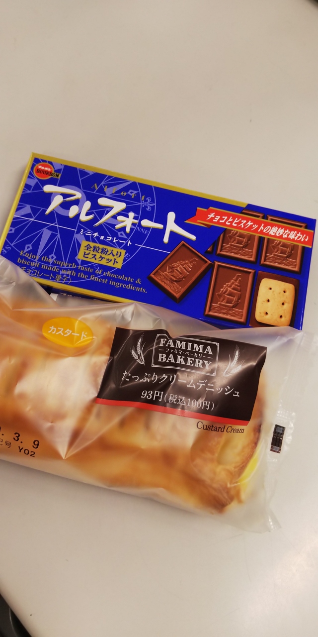 お馴染みのコンビニエンスストアのファミリーマートです。朝食用にファミマPBのたっぷりクリームデニッシュパンとアルフォートというチョコレート菓子を購入しました。また機会があったら利用したいなと思います。