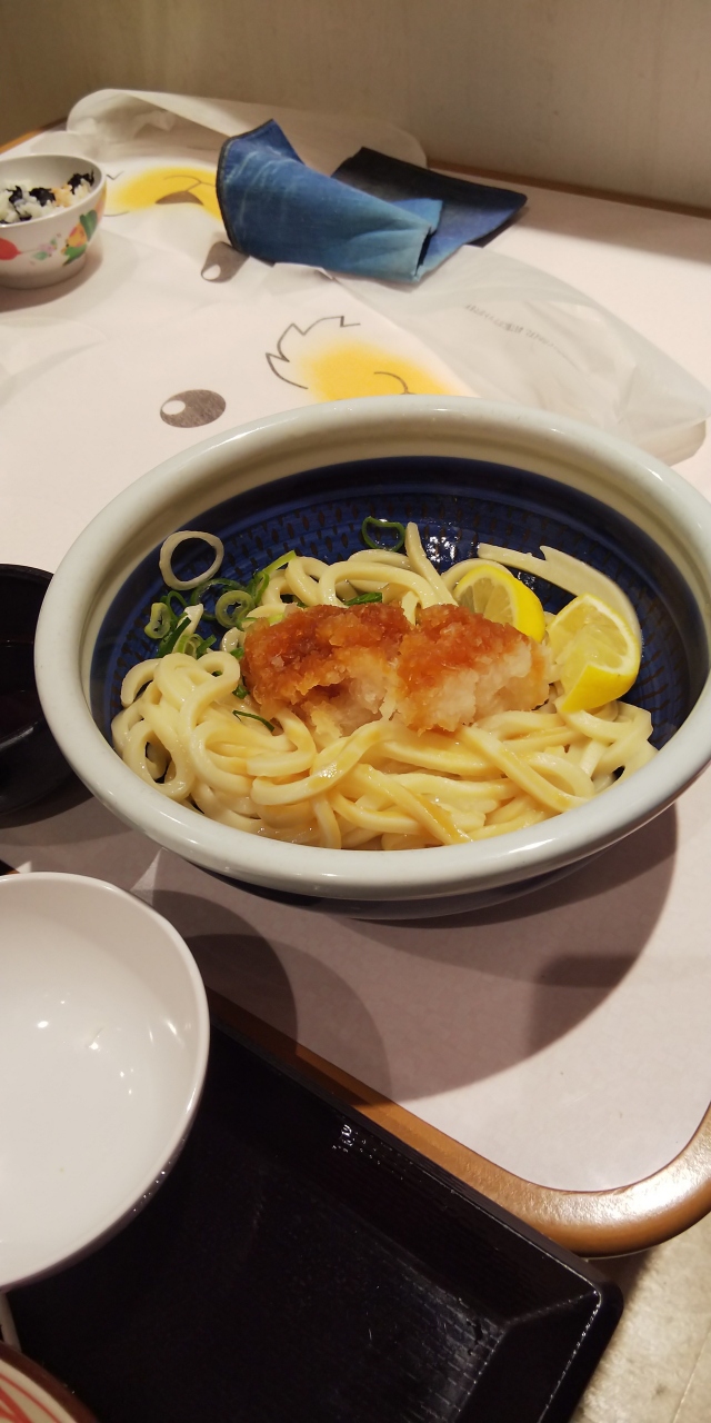 讃岐うどんのチェーン店で、ロードサイドの独立店やフードコートの中などいろんなところにあります。子ども達がうどん好きなのでよく利用しています。今回はぶっかけうどんとざるうどん、かき揚げの天ぷら、昆布おにぎりなどをオーダーしました。なかなかおいしかったです。
