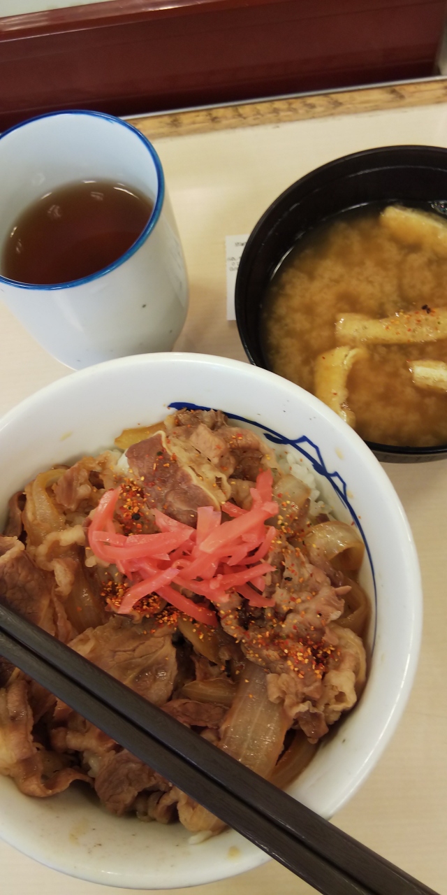 平日のランチで利用しました。牛めしをオーダー、320円でお味噌汁付きです。紅ショウガを乗せると美味しいですね。他の牛丼チェーン店に比べて、松屋は料金内に、お味噌汁が付いているのが嬉しいです。また機会があったら利用したいと思います。