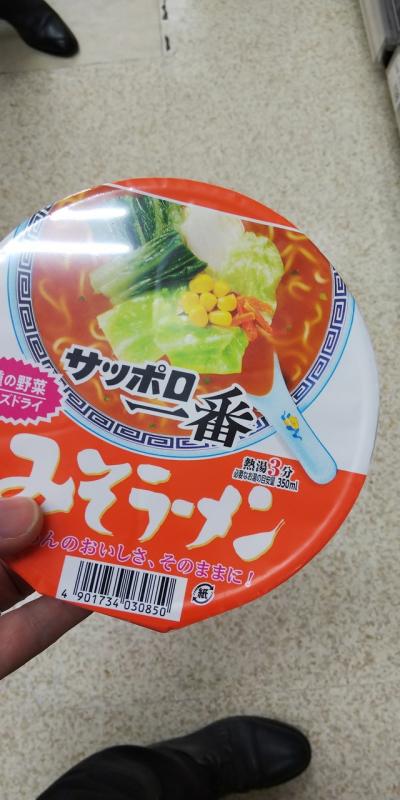 今回はサッポロ一番の味噌ラーメンを購入しました。ほかにも、家電製品やお菓子、お弁当、おにぎり、飲み物などいろいろそろっていました。