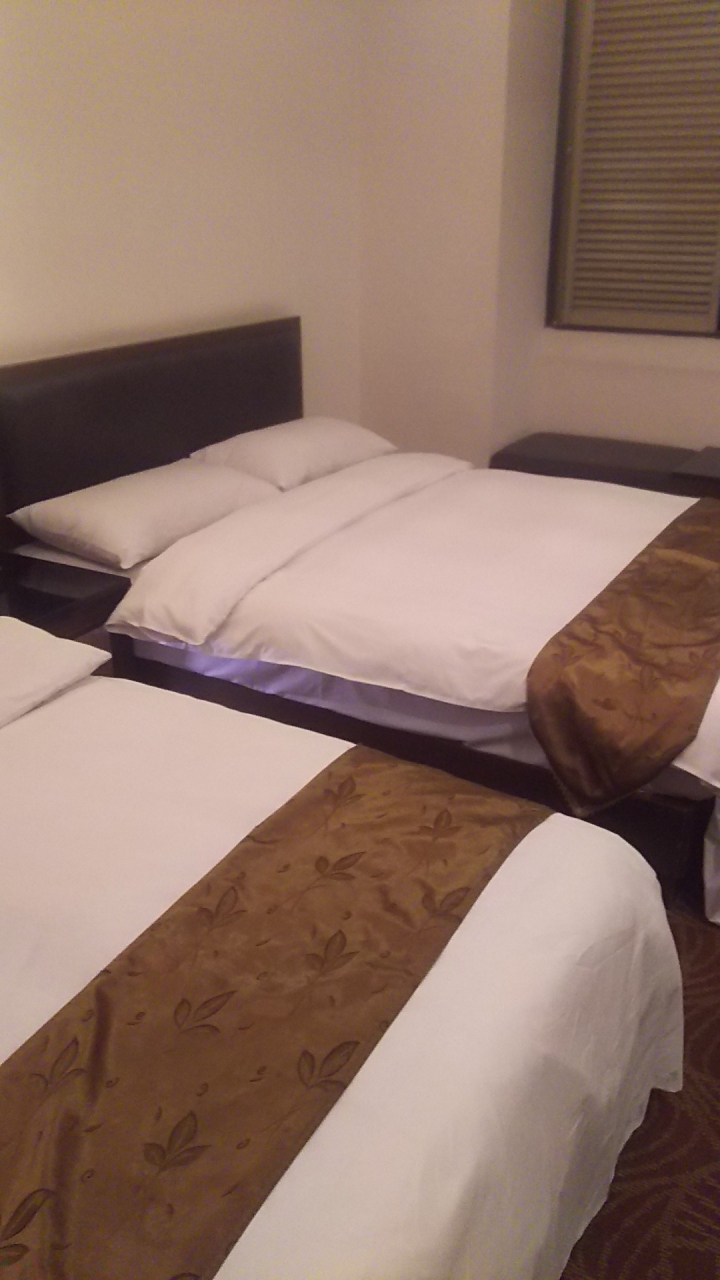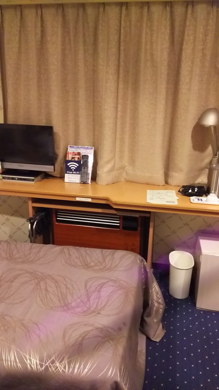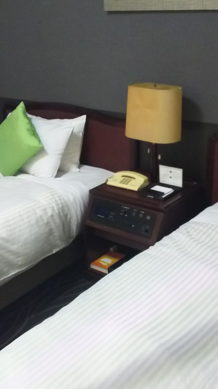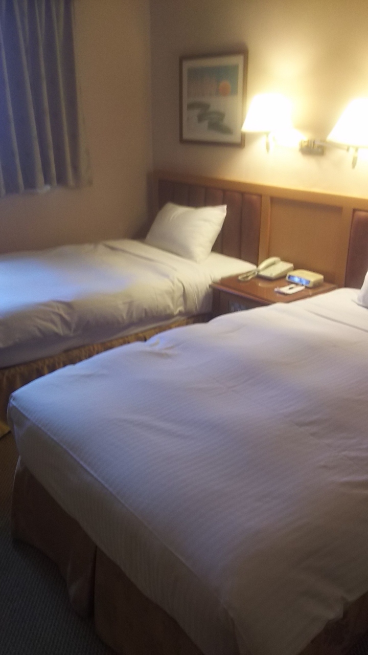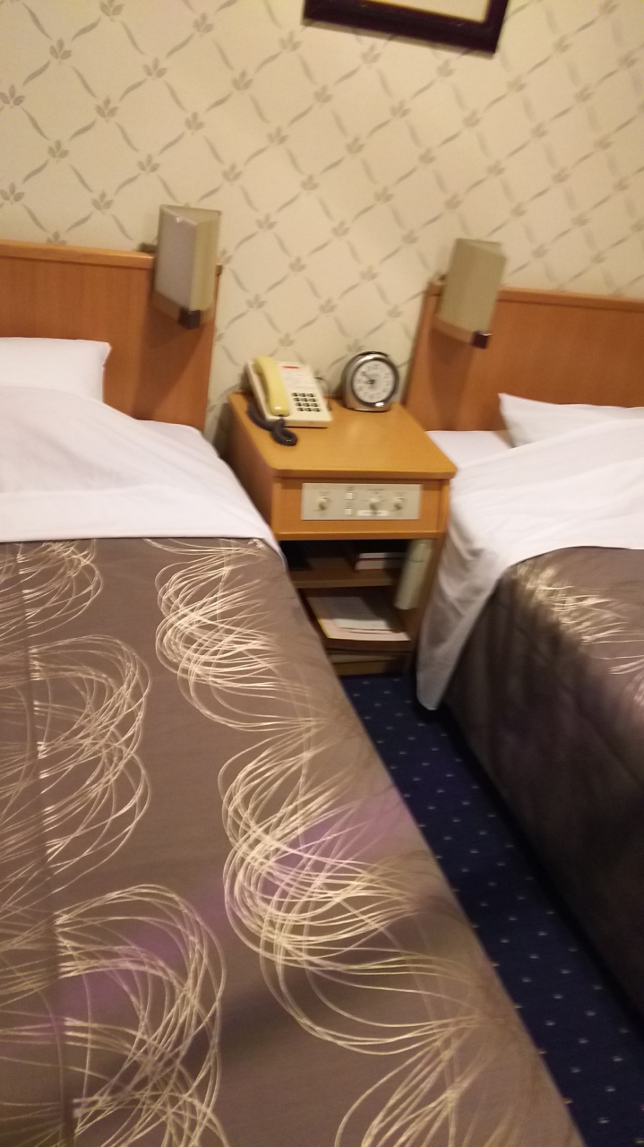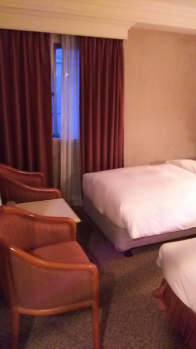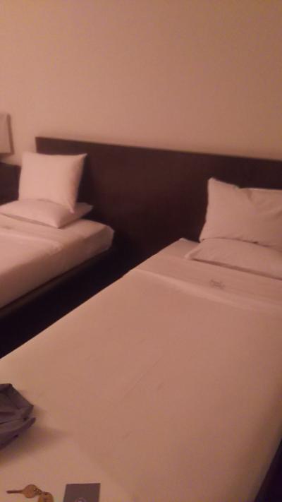 部屋はツインルーム、少し手狭な感じですが、実用には差し支え有りません。部屋はこの手のホテルに有りがちな照明が暗い造りです。ベッド脇に差し込みは有りません。
