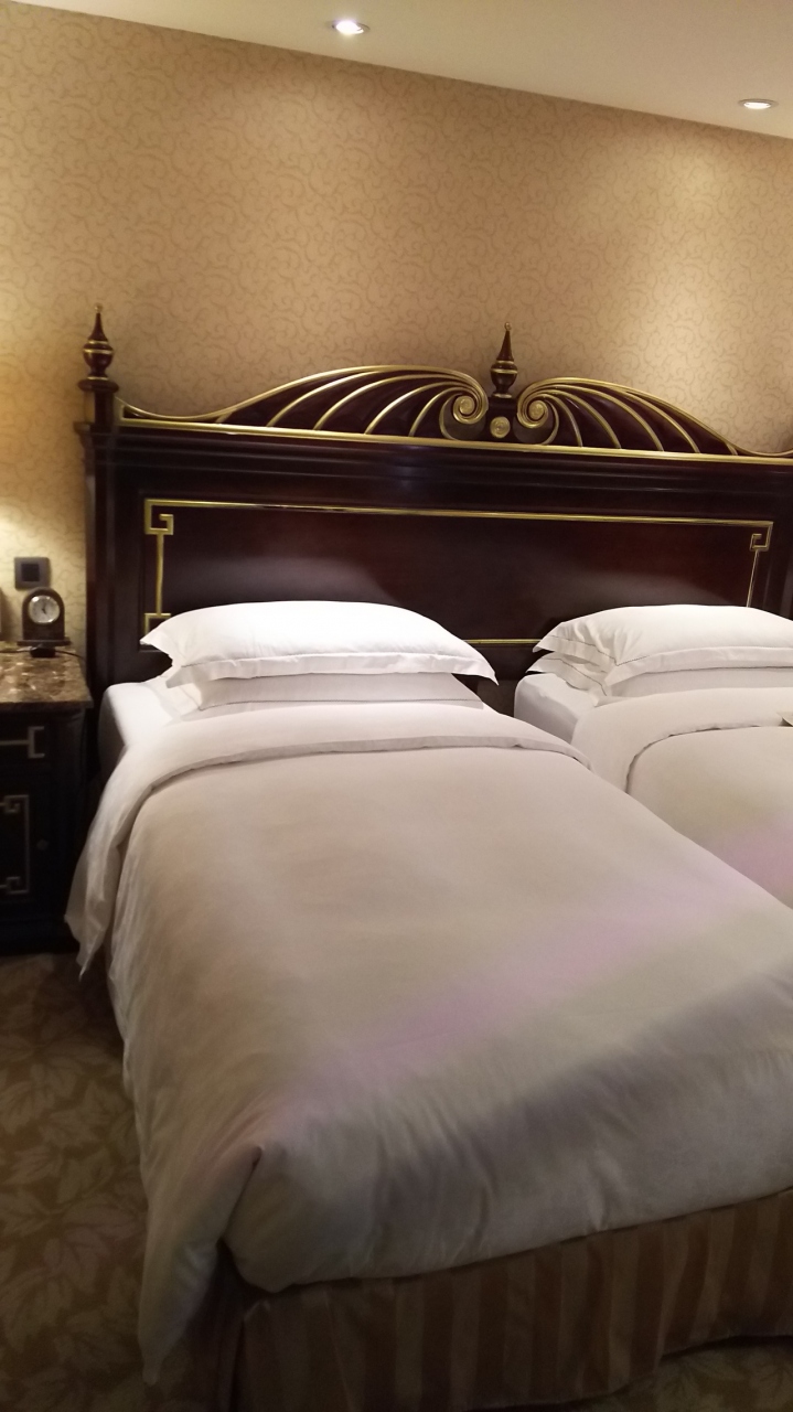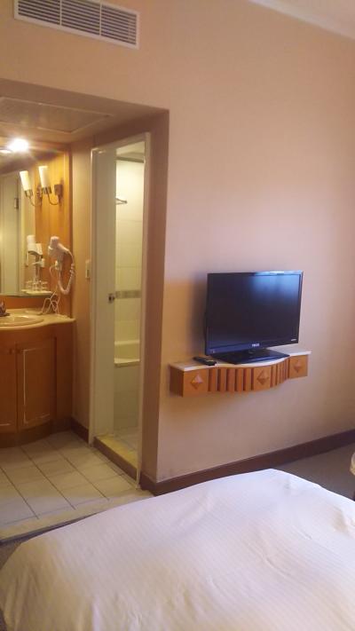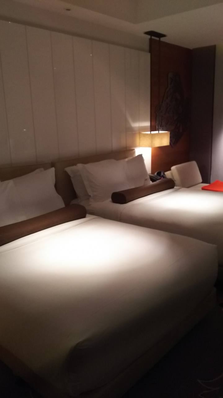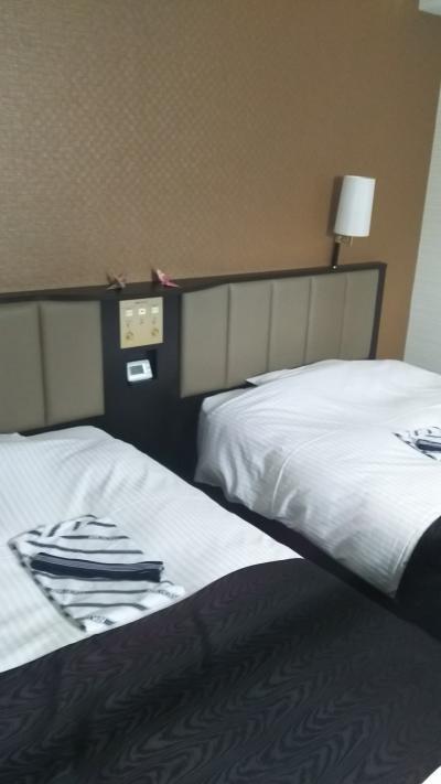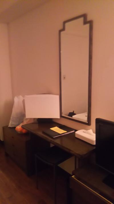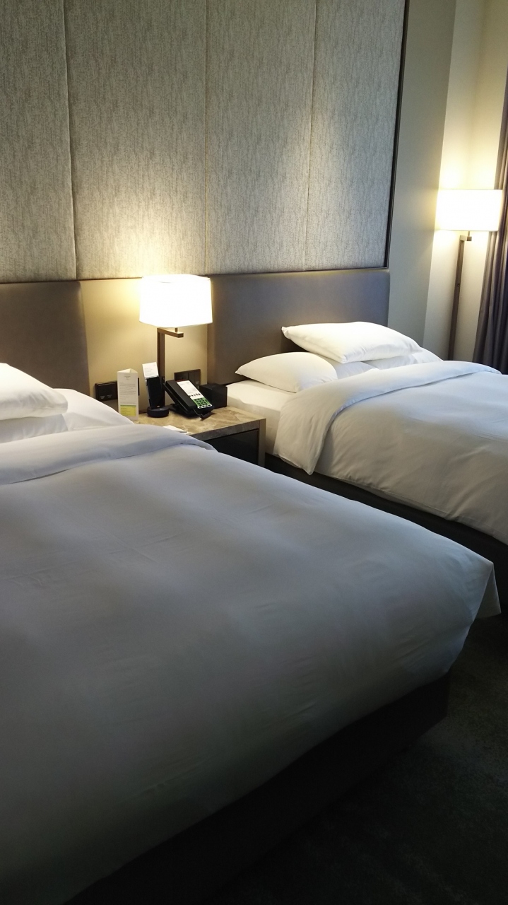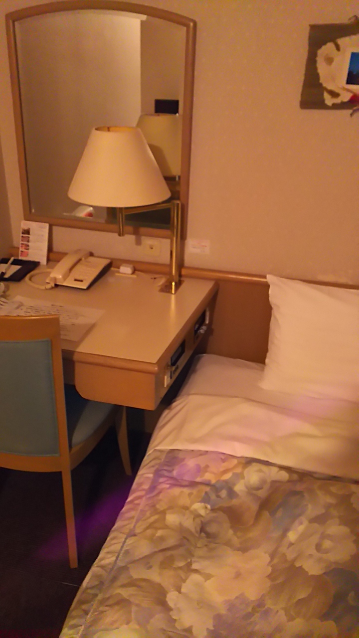 部屋はツインルーム、少し手狭な感じですが、実用には差し支え有りません。部屋はこの手のホテルに有りがちな照明が暗い造りです。ベッド脇に差し込みは有りません。