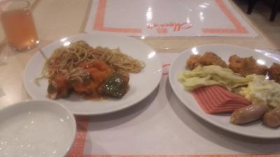 晩ご飯は2階のレストランでかに食べ放題とバイキング料理、普通のステーキが付いて4,500円でした。