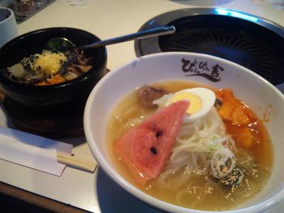 今回いただいたのは冷麺と石焼ビビンバのセット。