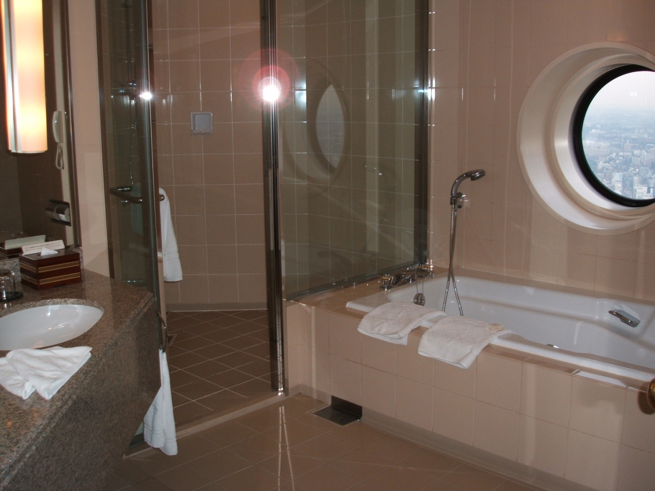 今回はコーナーにあるデラックスルーム。バスルームに丸い窓がありここからも夜景など景色が楽しめます♪広々していてくつろげますよ。