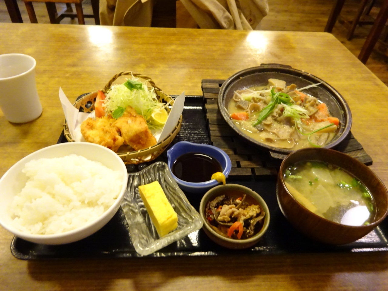メニューは多くありませんが、1200円の定食はおかずを2品選ぶことができます。このおかずの種類は多く、どれも美味しそうで迷ってしまいます。私が選んだのはとり天と土手煮です。初めて食べたとり天は熱々でとってもおいしかったですよ。他に卵焼き、漬物、味噌汁とご飯が付いていました。