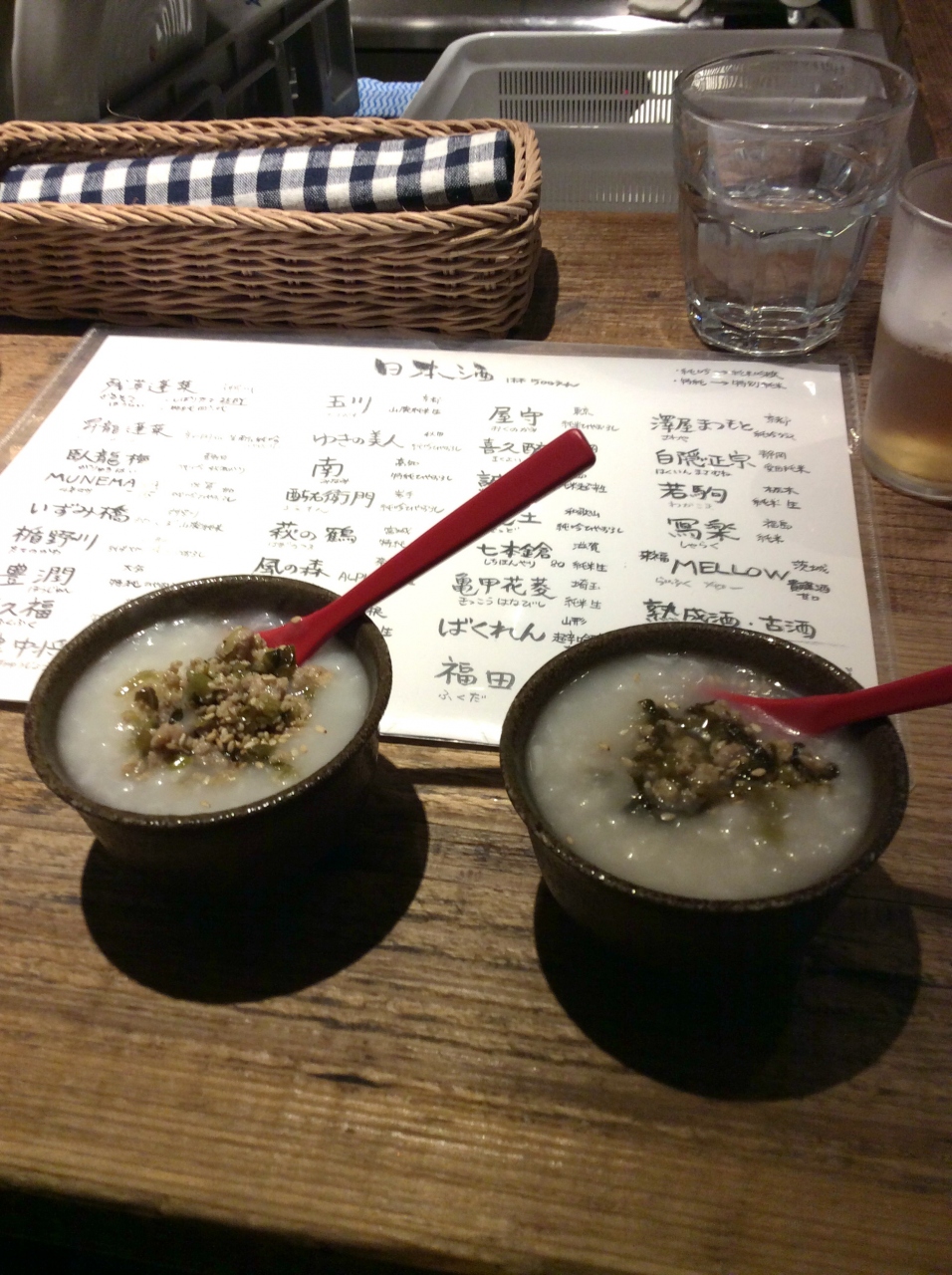 まずはビールで一杯。初めに出てきたお通しは中華風のお粥でした。お粥のお通しにびっくり!さらにおいしくてびっくり!!