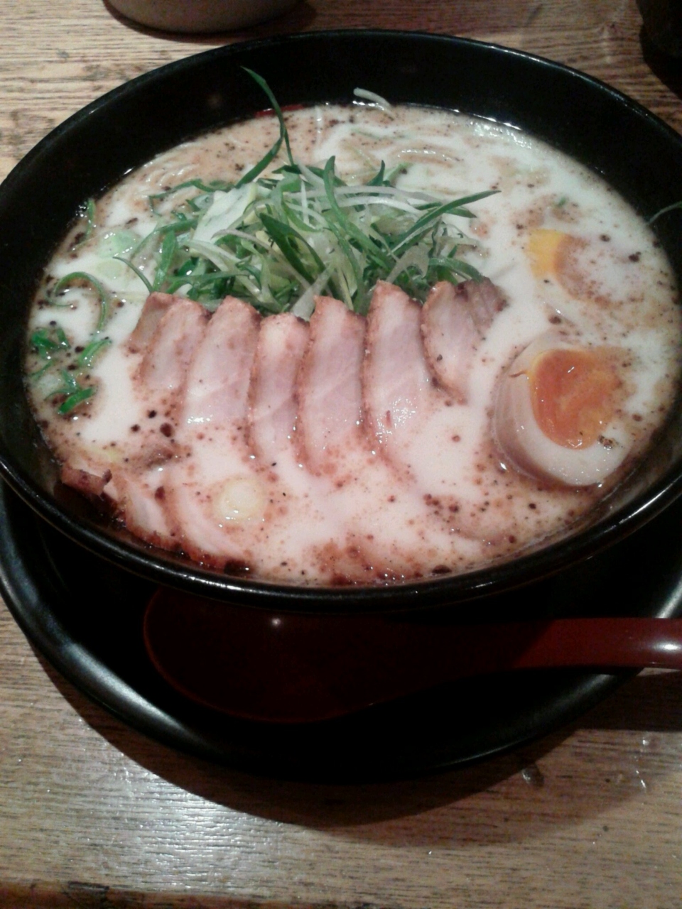 市営中津駅から徒歩400m位の場所で、高速道路が上を走る横断歩道を渡った角に店舗がありました。大阪とんこつラーメンが売りのようです。チャーシューは薄めの物が沢山入って、半熟卵が絶妙な味付けで、ねぎがたっぷりのっていました。味はあっさりしていて麺も九州のとんこつの様な細い麺ではありませんでした。麺はもう少し固めが私は好みでした。