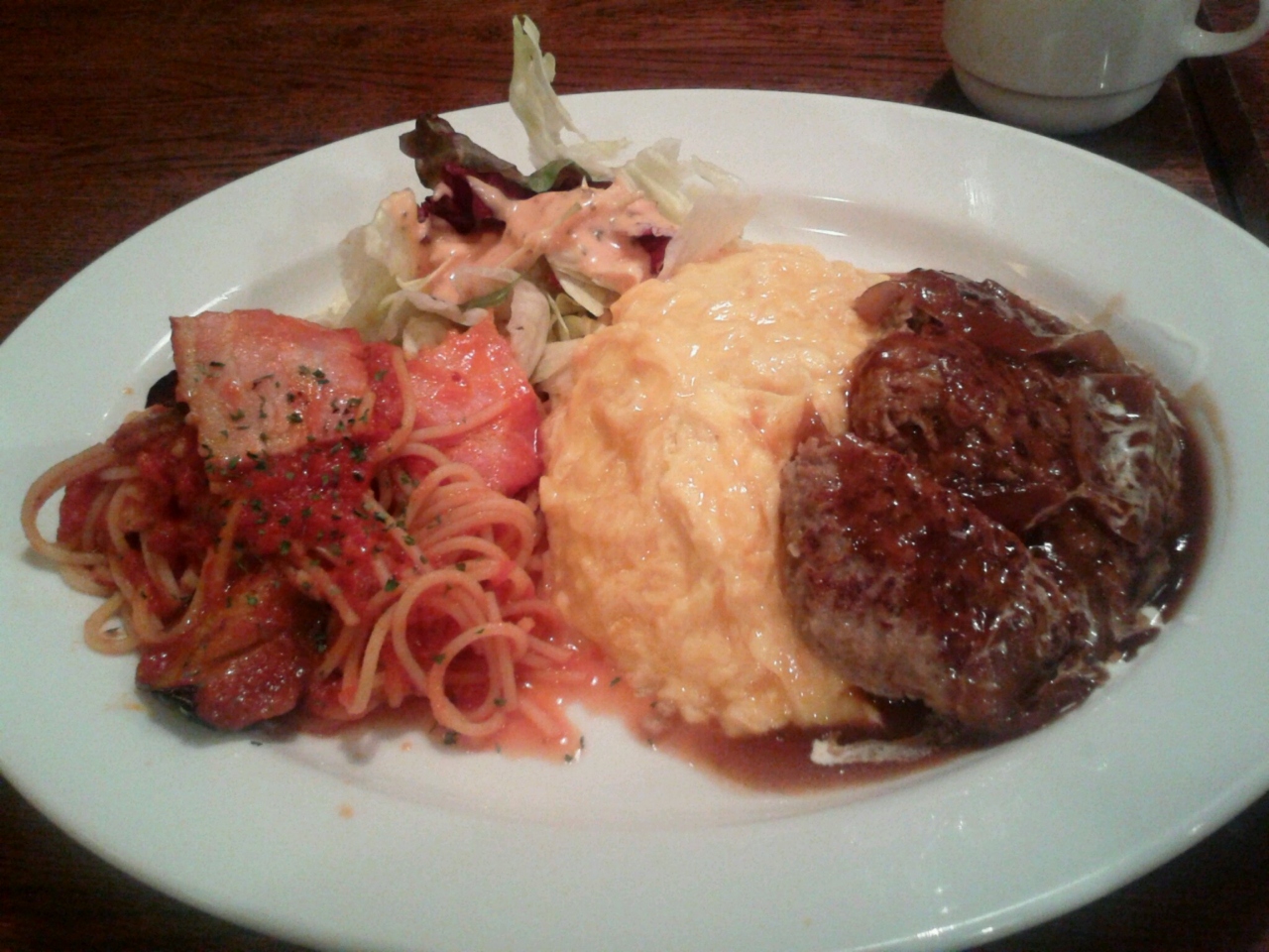 丸ビルのグルメ街にランチが17時までの店を発見しました。オムライスがメインのお店で、オムライス、パスタ、サラダがセットになったボリューム満点のランチを頂きました。パスタも3種から選べ、オムライスも3種から。スープもセットで付きます。ベーコンとなすのトマトソース、オムライスにハンバーグがトッピングされていました。