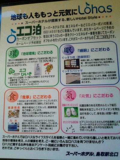 鳥取駅には駅前と北口があり、北口は駅から少し歩きますが、鳥取砂丘に行くバスターミナルが近くで、天然温泉が入れます。3人の洗い場しかないので、タイミングで混雑する場合があります。女性にはアメニティがかなりの種類から5品選べます。エコに心掛けているようで、歯ブラシを使用せず返却すれば気持ちだけのお菓子が頂けます。部屋は狭いのでツイン希望の私には、ロフトは苦痛?なので広いベットで寛いでしまいました。無料朝食をバイキングで頂きました。食器は返却口で区分けします。