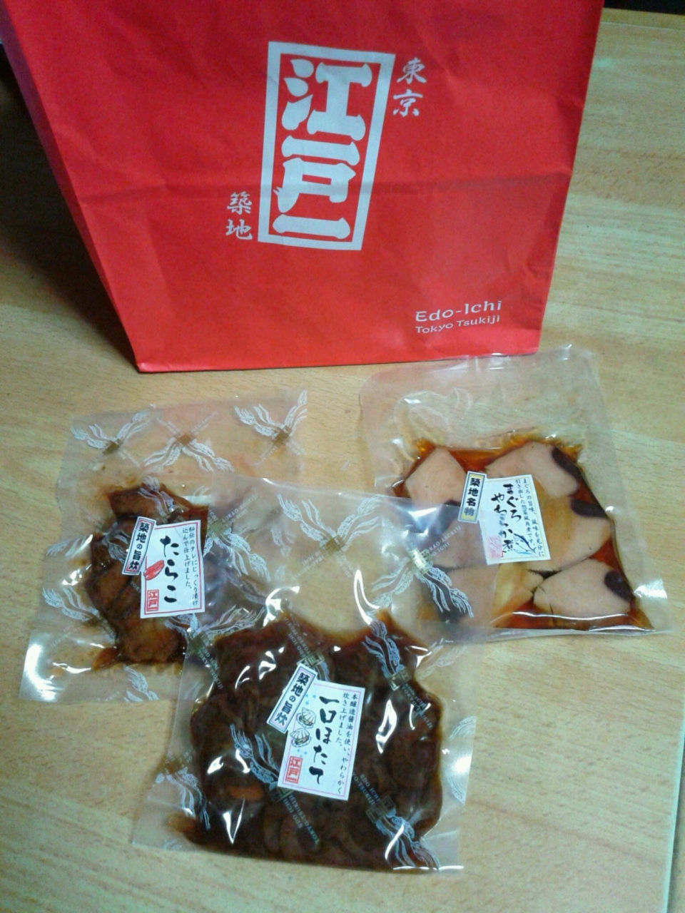 毎回築地を訪問するときは場外市場にある江戸一の佃煮を購入します。1つ300円ですが、4つ購入すると1000円になります。日持ちも2か月くらいなので、お土産に沢山購入して行きます。自分宅の食べる分が無くなるとまた出かけます。