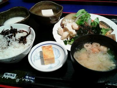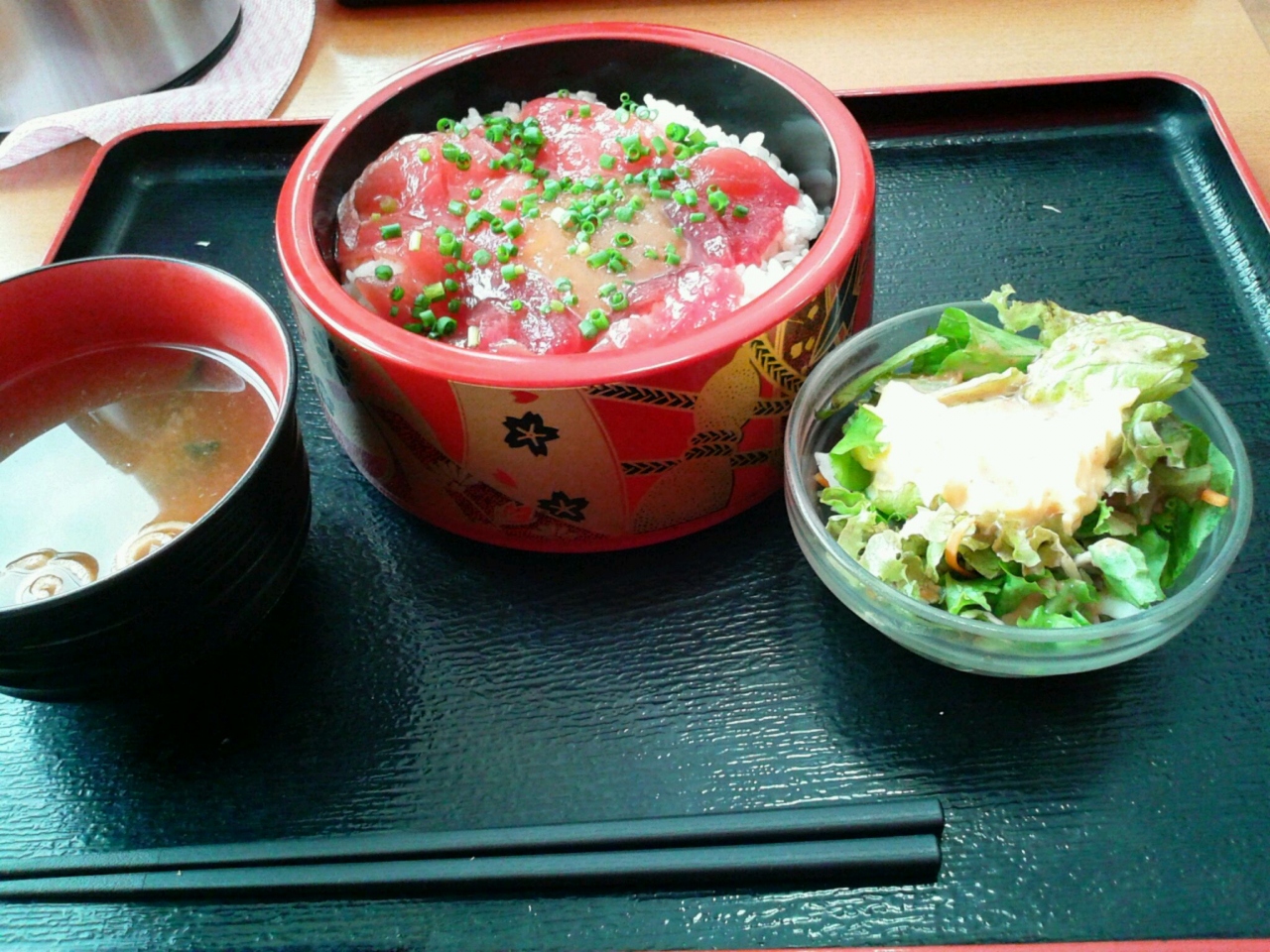 この日はテレビ朝日の取材が入っていました。13時頃に入店しましたが、身分証明もなく自由に入れる庁舎の食堂なので賑わっていました。お値打ちな漬けまぐろ丼御膳650円にしました。丼、味噌汁、サニーレタスにゆで卵のサラダがセットになっていました。梅のソースが上にかかっていたので、少し酸味が感じられました。ガラスケースに1品づつ選べる料理もたくさん並んでいたので、料金を計算しながら好きなものを好きなだけ選べます。