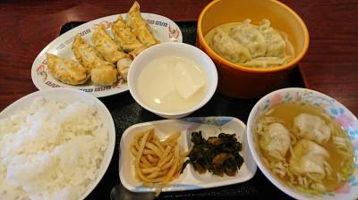 水餃子、焼き、揚げ、蒸しに杏仁豆腐、シナチク、ご飯、漬物のセットです。
