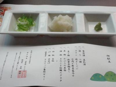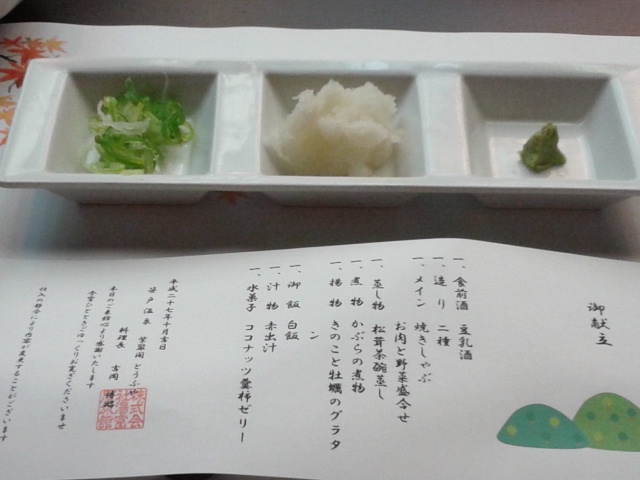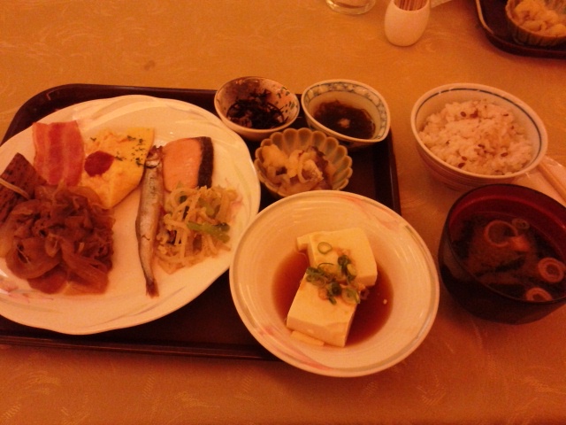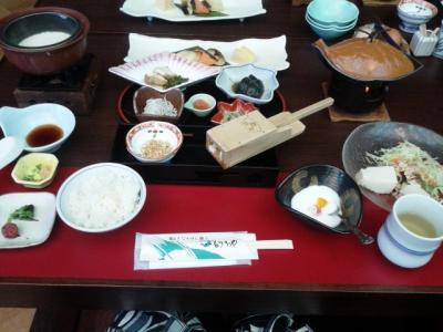 名古屋から1時間程車を走らせて到着。コンビニまで車で10分、矢作川に佇む温泉旅館で川には鴨がたくさんいました。夕食は名前はとうふやですが、しゃぶしゃぶ、刺身などどこでも味わえる料理ですが、朝食にはとうふ料理がありました。朝食はご飯が3杯食べられるという謳い文句の通り、生卵、焼魚3種類、明太子、とろろ豆腐、煮しめ、カレー豚肉の陶板焼きなどがありました。具沢山の味噌汁は大根、人参がゴロゴロ入っただけの一人1杯分程度でちょっとがっかりでした。お風呂は下呂と同じような源泉なのかしっとりと体になじむ感じでした。