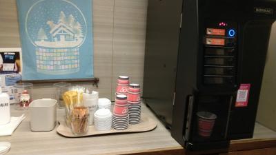 以前は客室に無料のミネラルウォーターがありましたが、今回から各階にあるサーバーで飲むようになりました。ラウンジではコーヒー等も飲め、レンジでお弁当等も温めることが出来るようです。周辺は飲食店も多く、駅も近いので便利です。