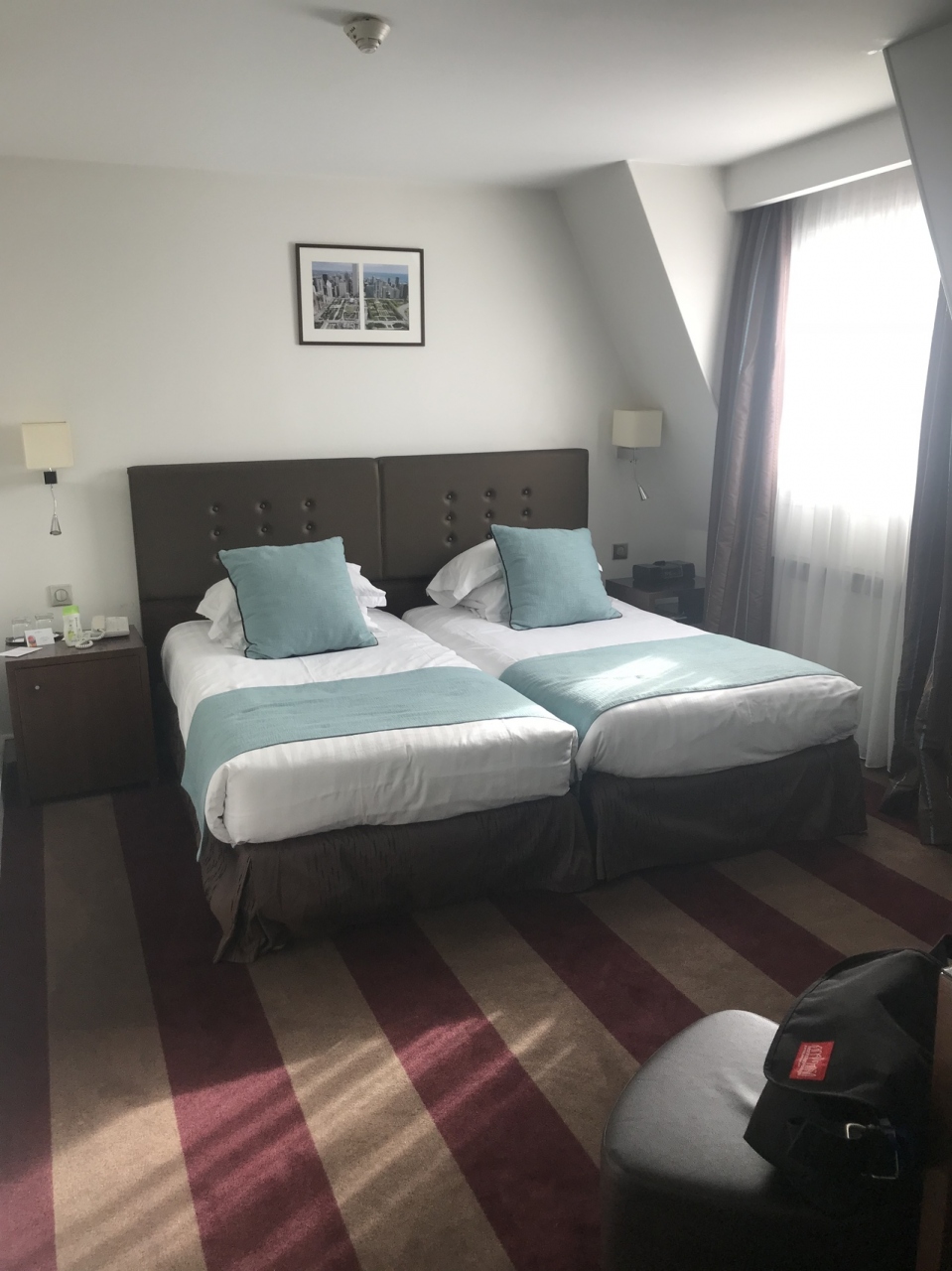 ロビーやエレベーターなどの施設の古さは否めないし、スタンダードツインの部屋はそれほど広くはなかったものの、大型のキャリー2個を広げるスペースは充分ありました。冷蔵庫の飲み物もフリーで、毎日補充されたのがありがたかった。幅が若干狭いけれどバスタブもありましたが、シャワーは固定でした。朝食のパンがとても美味しかった。またパリに行くなら是非泊まりたいホテルです。