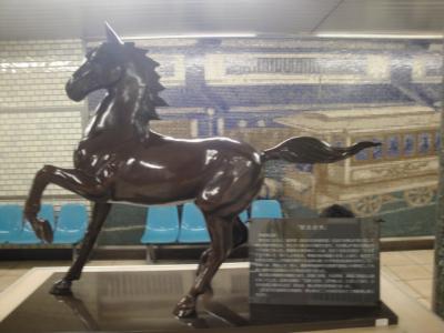 都営新宿線から 浅草線・東日本橋駅に乗りかえる途中で見つけました。駅名が「馬喰横山」なので馬に関係する地名だろうと推測しました。ブロンズの馬の像のところの解説文には「江戸時代、馬場がありました」と記述がありました。改札口の中にあります。(外の通路から見えます)