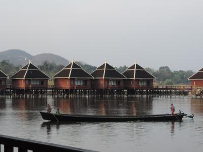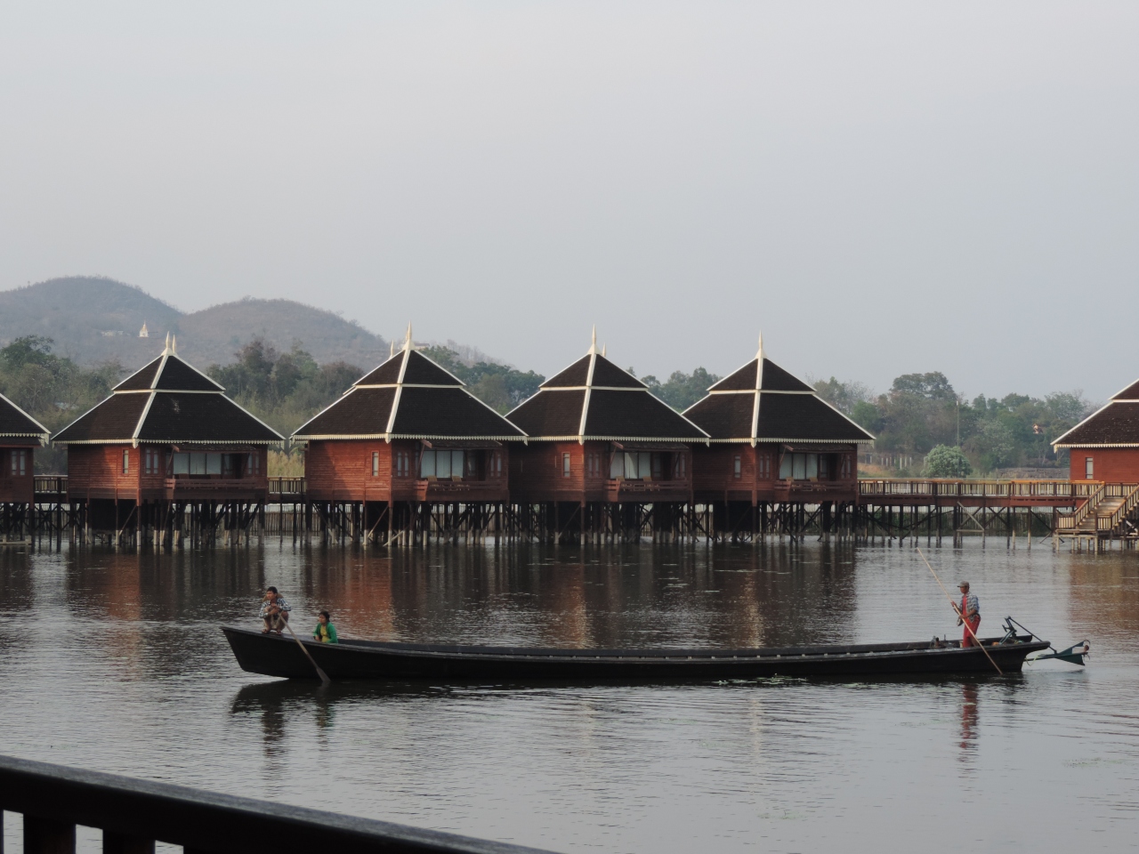 幾つものコテージが湖上に並び、その一棟を家族で独占。まるで別荘に泊ったようで、ベランダは湖の上にあり心ゆくまで夕暮れや明け方の風景を楽しめる。食事は階段を登った本館でだが、その途中の道も野趣に富んでいて楽しい。夕食は地元シャン族の料理を味わったが、実に美味であった。標高が高いところにあるので暑い季節だったが涼しく快適。
