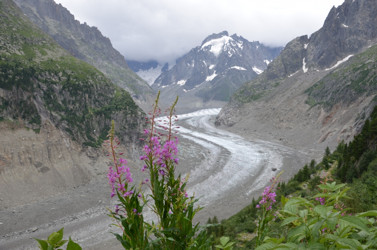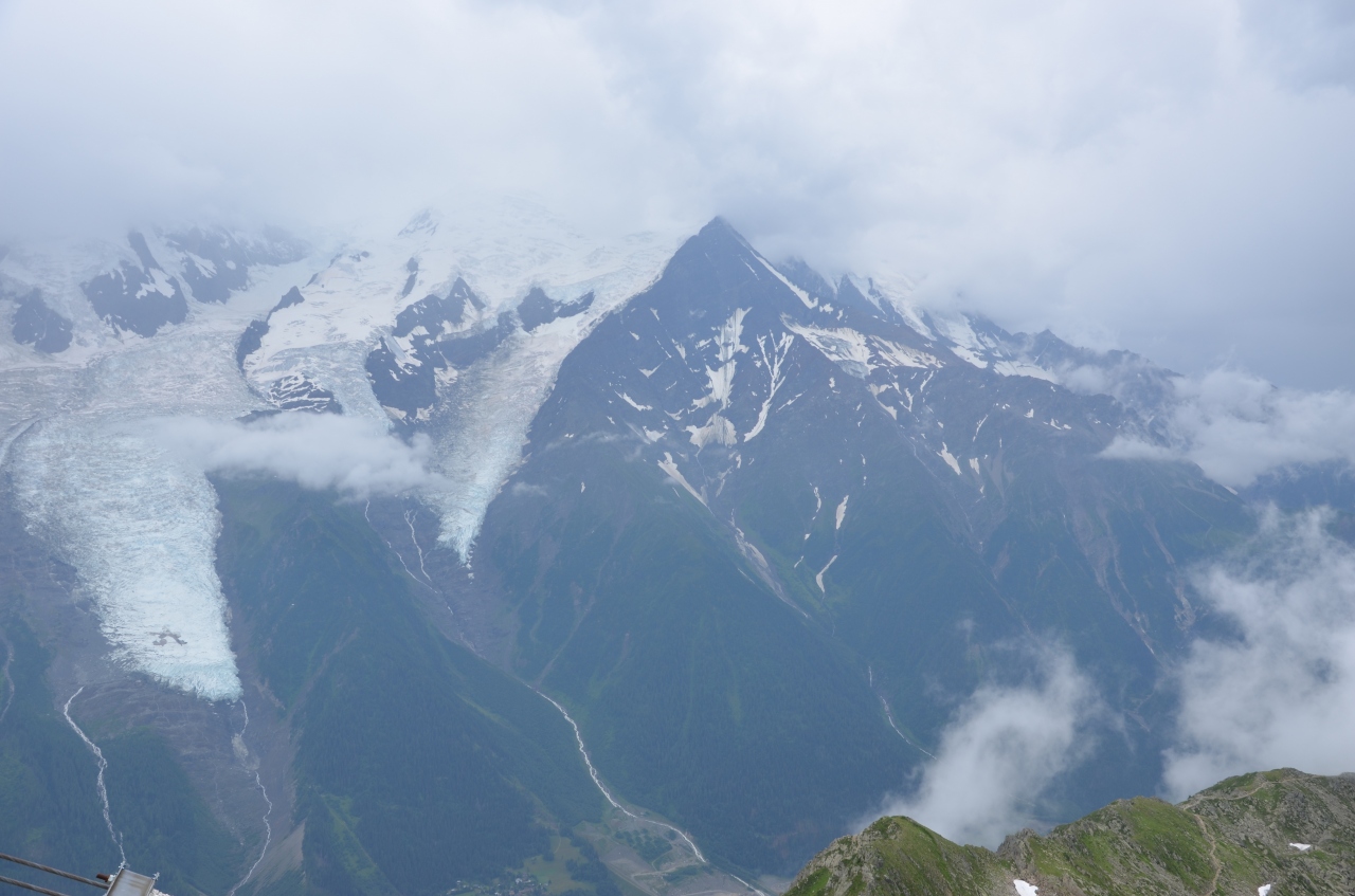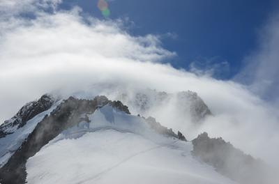 シャモニーから午後4時過ぎに乗った時は、外は雨だった。25分かけて着いたモンタンヴェールの駅は濃い霧の中で、観光客もまばら。しかし、しばらく待つうちに霧は晴れて、大氷河メール・ド・グラスの全貌が現れた。周りの山々もヴェールを脱ぎ、見事な景色にうっとりした。奇跡は20分だけ。また霧が覆い全てをかくしてしまった。