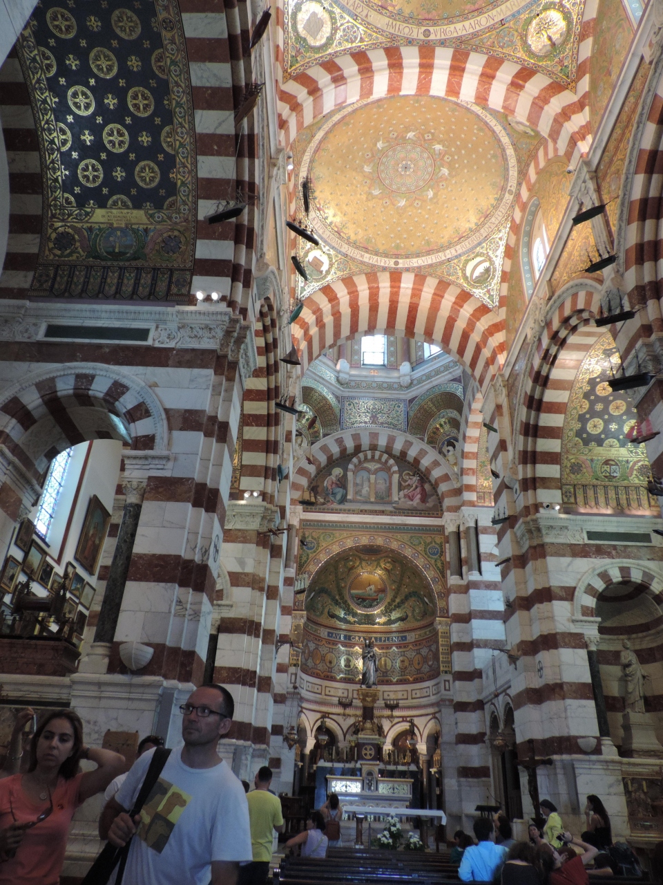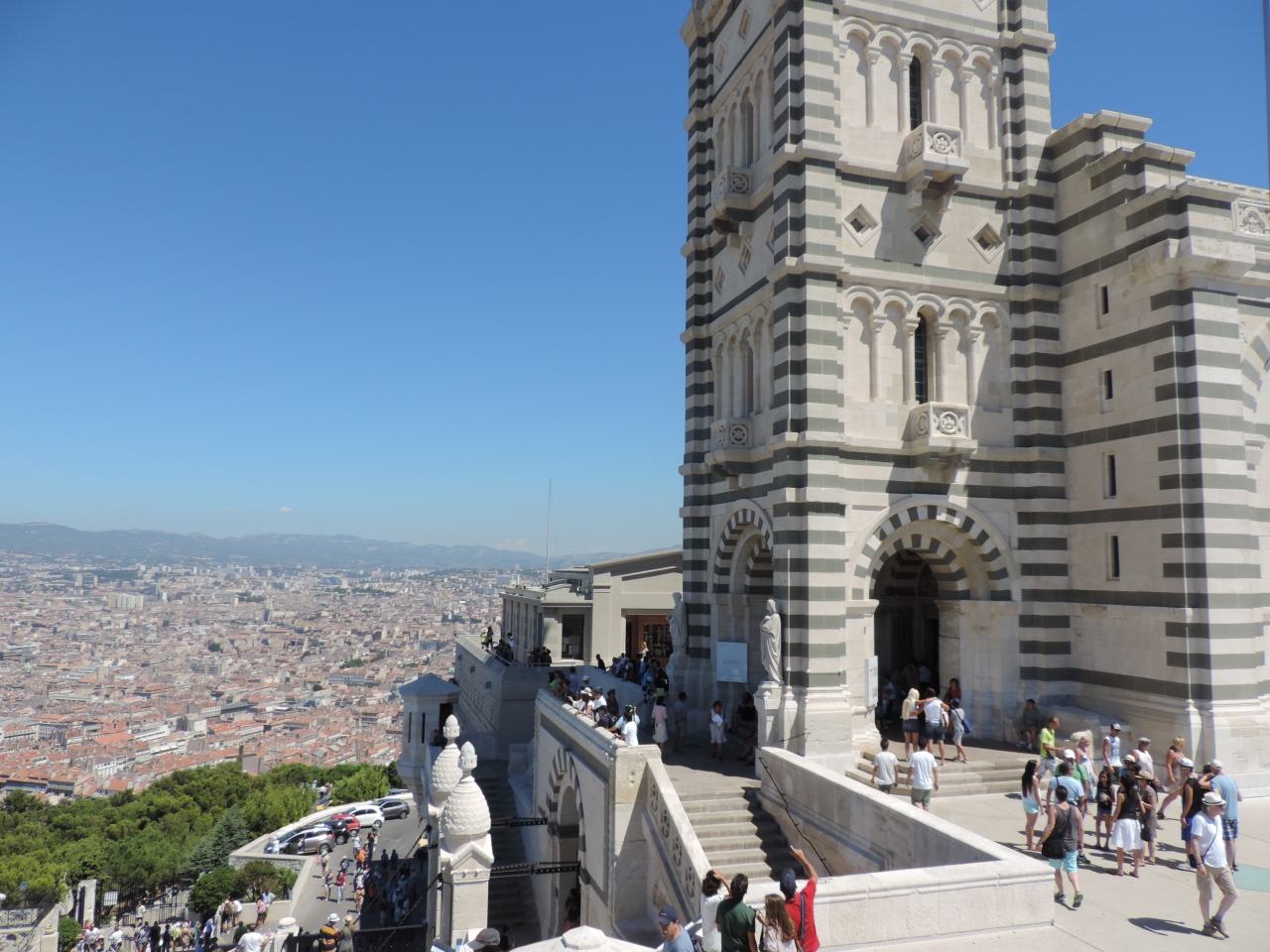 旧港からバスで15分ほど。坂を上って着いたこの聖堂は、まず眼下に広がる地中海と、マルセイユの街の大展望に感激する。聖堂は巨大で全体は5階になっていて、最上階の礼拝堂は海を守護するため、船の絵や模型があって興味深い。
