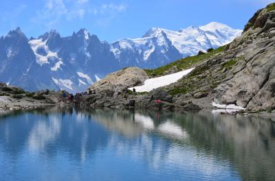 シャモニーからバスでプラへ。ここからロープウエイでフレジュール。リフトに乗り換えランデックスに。モンブラン山群を見ながらお花畑と残雪の道を、のんびり歩いて2時間ほどで山上の湖ラックブランに着く。