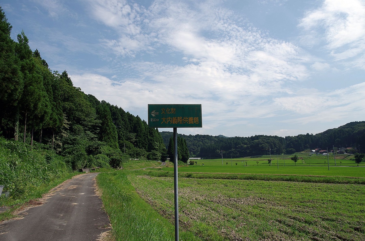 県道315線から細い農道を道しるべに沿って行くと民家のシャッターにペンキか何かで「大内→」と書かれていて車一台がやっとの畦道のような道を行くとまた看板があり、濃度脇に車を停めて山の中に入って行くとやや小高い丘のような所に供養塔が3基建っていました。