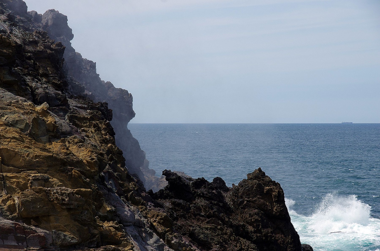 冬場に比べれば、海が荒れていないせいか、潮は高くは上がりませんが、近くに行くとミスト状の海水の飛沫が風に流されてきます。