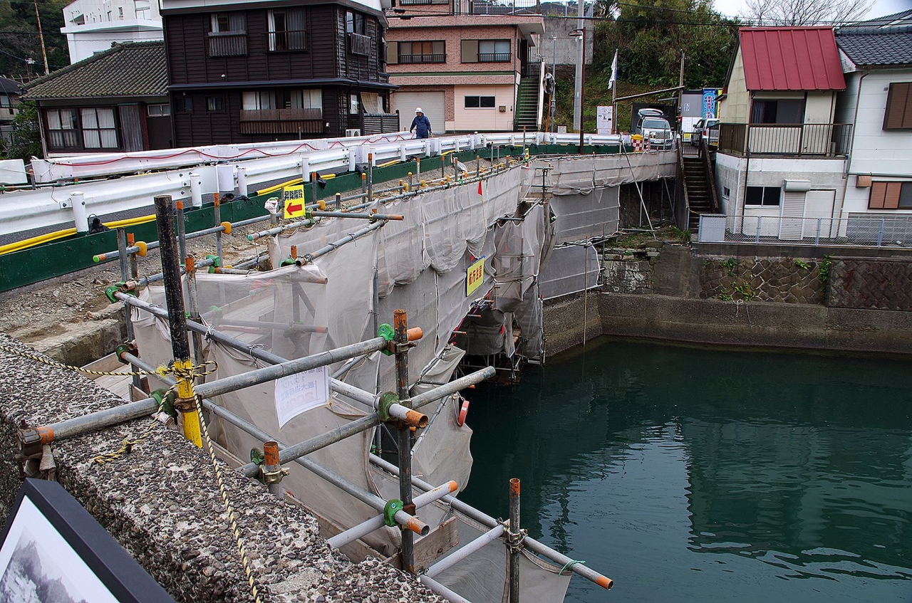 資料館で見た堀川橋のアーチ型の石橋に思いを馳せながら当地に行くと橋は回りに覆いをされて工事の真っ最中でした。