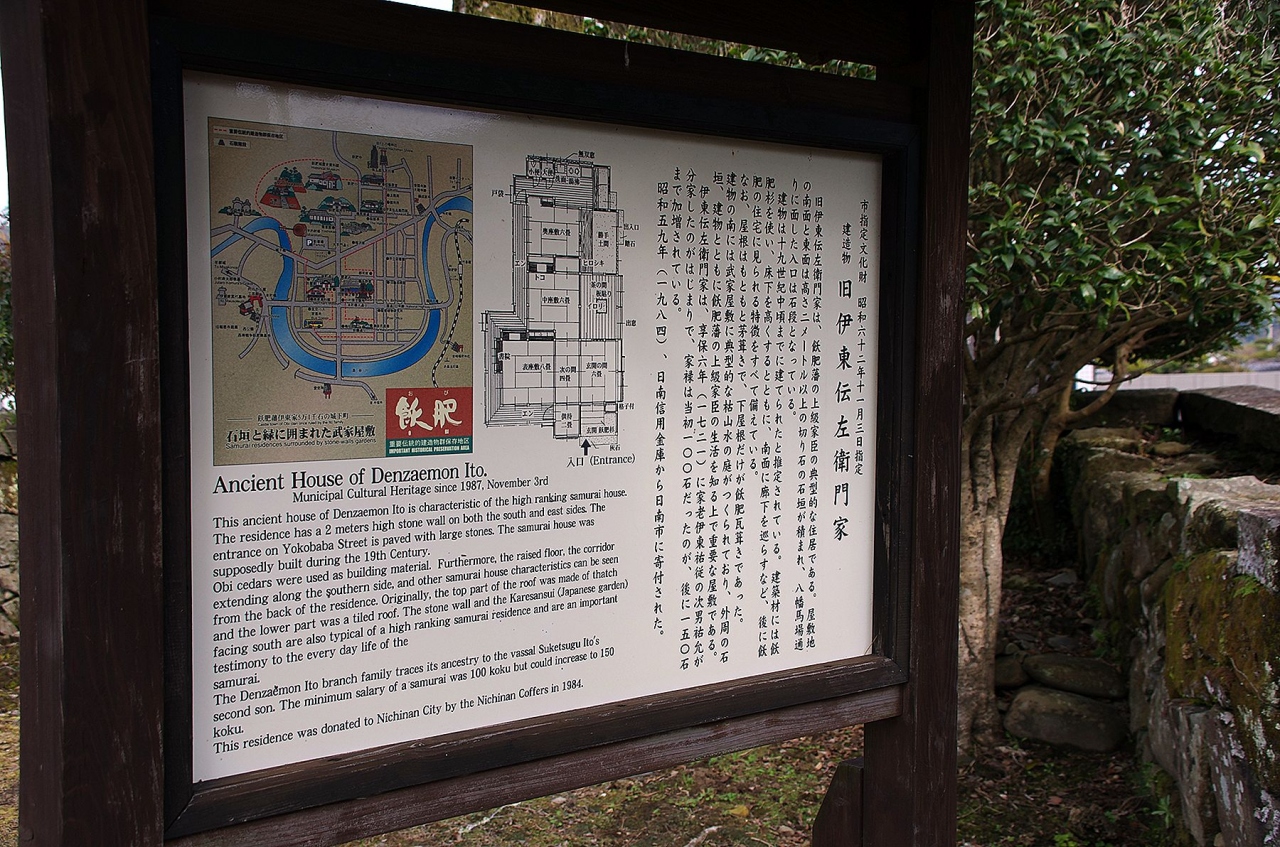 - 飫肥城跡から武家屋敷通りに向かい案内板に沿って行くと着きます。
