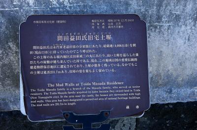 こちらの土塀は山口市の問田に領地を持っていたことから問田益田氏と呼ばれた永代家老益田家の分家筋にあたる問田益田氏旧宅の土塀です。下部の石垣と上部の塗り壁に分かれ、石垣部分は高さ約1.45m、幅0.8mの本瓦葺き。延長231.7mにわたる土塀は、萩市内に現存する土塀のなかで最長と言われています。