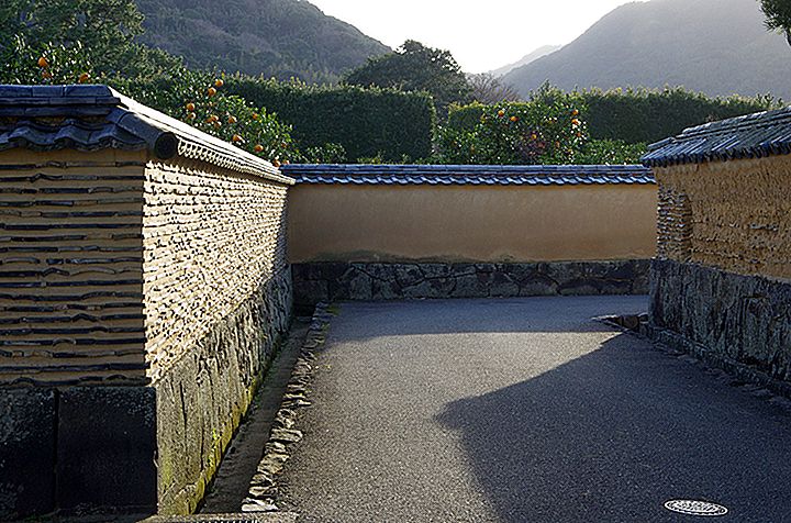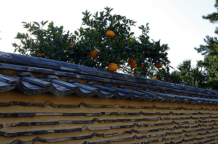 鍵曲の両脇の壁面は土塀に覆われていてその土塀に夏みかんが覗いている風景は歴史をタイムスリップして幕末の萩にいるような気分にさせてくれます。