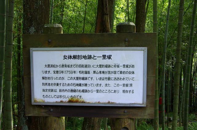 道の駅萩往還の道路を隔てた向こう側の竹やぶの中には「栗山孝庵女刑屍体腑分之跡」の碑と一里塚跡が残されています。