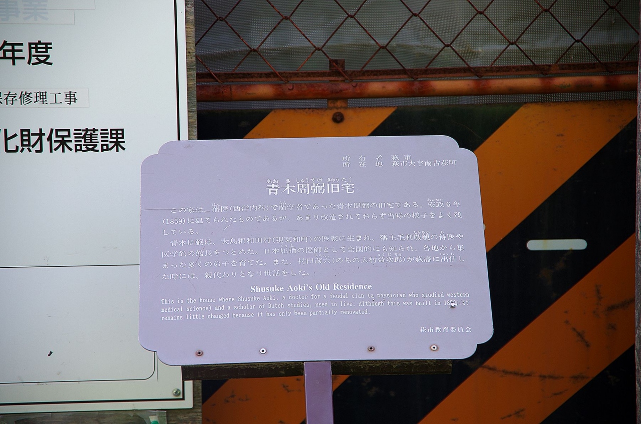その青木周弼が生まれ育った旧宅地は平成25年6月30日から平成28年3月(予定)まで、保存修理を行うため公開休止ということで工事中のカバーが掛けられた建物の外観しか見れませんでした。もう2年も先にならないと見れないとは実に残念でした。- 旅行時期