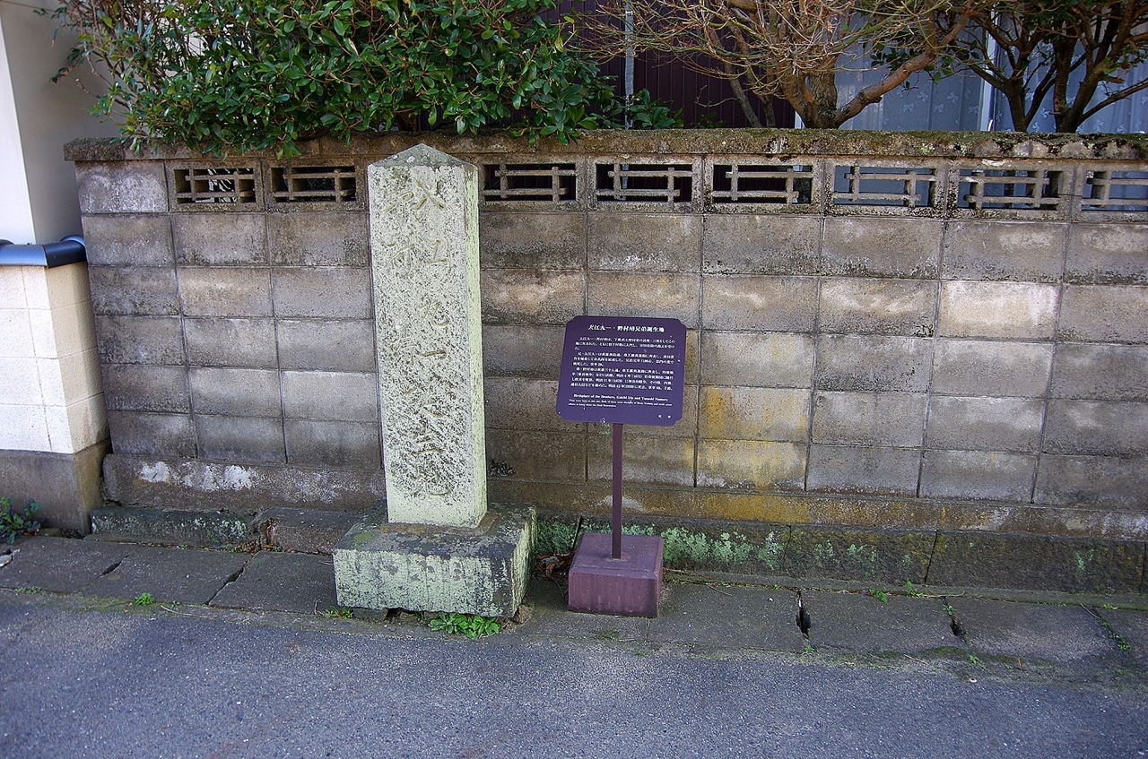 この前田孫右衛門旧宅跡も細い道路沿いの民家の前に石碑が建つのみで周りは現代の風景が立ち並ぶ。