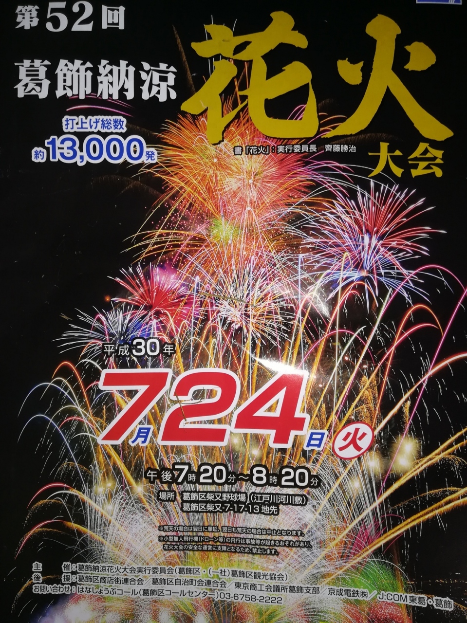 花火を鑑賞をさせて頂きました。多種多様な花火が沢山上がりました。ワールドカップの年でしょうか。原作者が葛飾出身との事もあり、キャプテン翼をテーマにした花火も上がりました。オーストリアのウィーン、オーロラをテーマにした花火もとても良かったです。