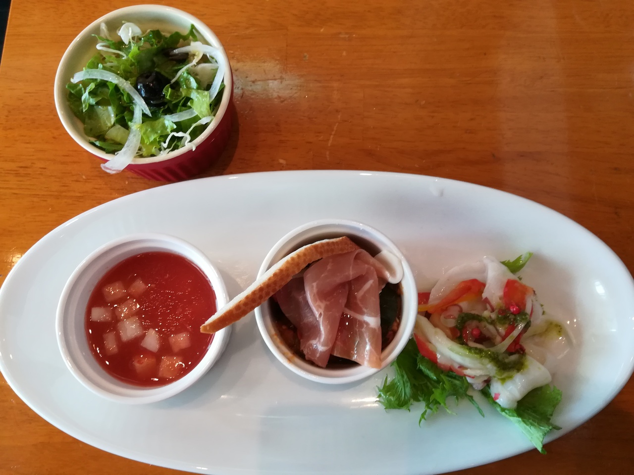 ランチに利用させて頂きました。ランチセットを注文させて頂きました。価格、味、量ともに大満足でした。トマトとにんにくのパスタ、タコのマリネ、トマトの冷製スープが美味しかったです。ランチ時ということもあり、店内もお客様が一杯でした。