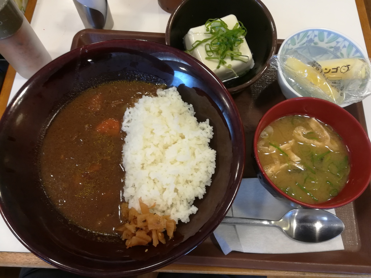 カレーが食べたくなりましたので、訪問させて頂きました。健康セットという、味噌汁と、冷やっこと、りんごがついたセットを注文いたしました。意外とカレーと、冷やっこは口に合いました。カレーの水分の量が多いのが、残念でした。