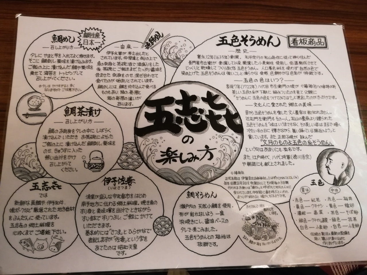 松山に訪問させて頂きました。その際に食事をさせて頂きました。愛媛の郷土料理を堪能できました。鯛めし、五色そうめん、みかんいなり、今治せんざんきと多種多様に楽しめました。味はどれも美味しかったです。お茶も美味しかったです。