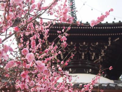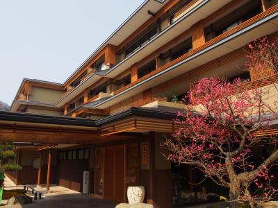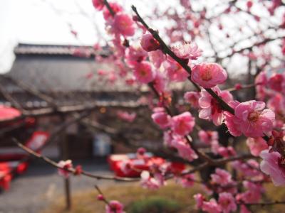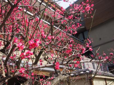 旅館の入口にも、梅が咲いています。白、ピンク、紅とそれぞれ咲いていて、...